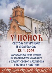 U Hramu Svetog Arhangela Gavrila u Čajetini u ponoć, u noći između 13. i 14. januara 2026. godine, biće služena Sveta Liturgija, nakon koje će biti održan i moleban povodom dočeka Pravoslavne Nove godine.
