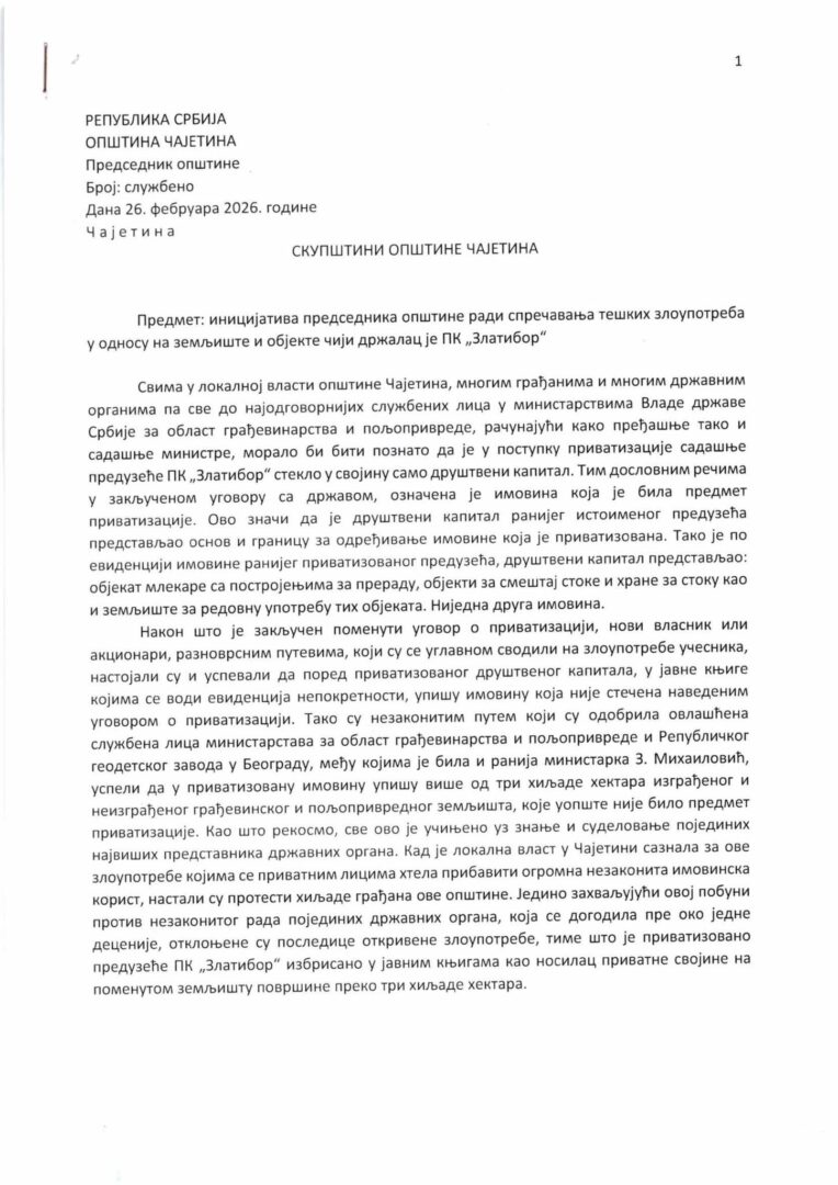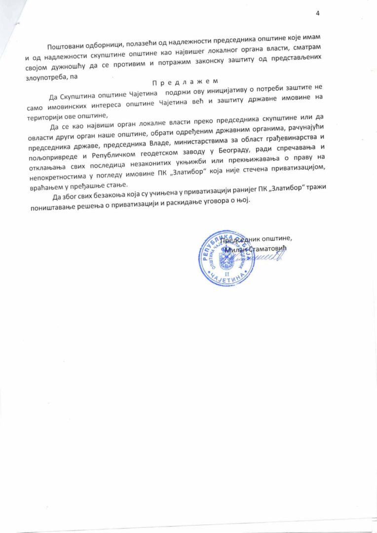 Skupština opštine Čajetina je jednoglasno podržala odluku predsednika Opštine Čajetina, Milana Stamatovića, da se podnese inicijativa za poništenje privatizacije Poljoprivrednog kombinata „Zlatibor“. Stamatović, je, na 16. sednici Skupštine opštine Čajetina, uputio hitan zahtev predsedniku i ministarstvima zbog korupcije na Zlatiboru i deset hiljada hektara koji se prenose na jedno lice. On je upozorio da je u ovom pokušaju privatizacije reč o multinacionalnoj kompaniji „čije sedište se nalazi na nekom drugom mestu, a da su neki pojedinci samo izvršioci čiji cilj je da ga kompromituju“.