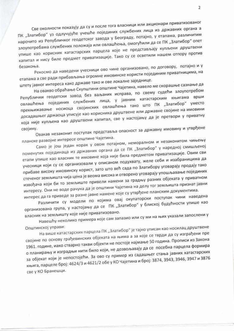 U predlogu inicijative se navodi da učesnici nezakonite privatizacije PK „Zlatibora“ žele sebi da pribave visoku imovinsku korist i da već sada po Zlatiboru ugovaraju tako stečenog zemljišta čija cena je visoka i otvoreno ugovaraju upošljavanje pojedinih izvođača koje bi to zemljište priveli nameni za gradnju raznih objekata u privatnom interesu.