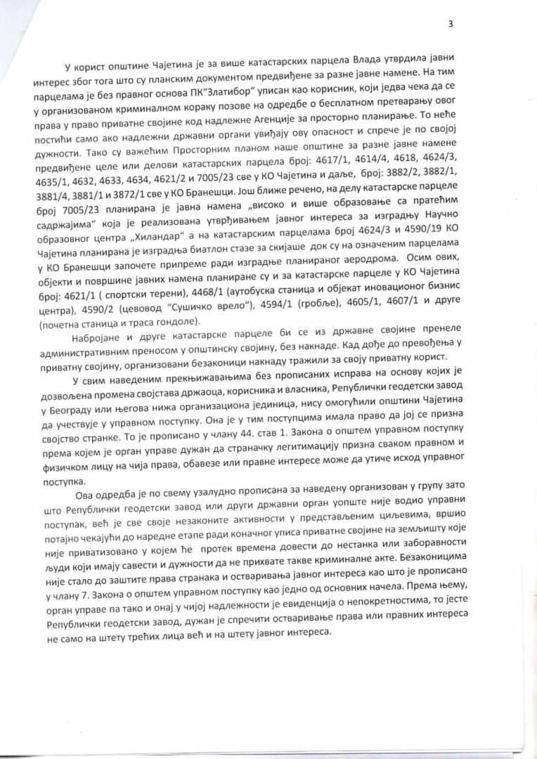 Predsednik Opštine Čajetina je podsetio na slučaj sa tadašnjom ministarkom Zoranom Mihajlović kada je zamalo preneto 2213 hektera u privatno vlansništvo na osnovu „navodonog ugovora“.