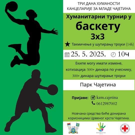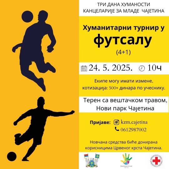 Kancelarija za mlade Čajetina, u saradnji sa Crvenim krstom Čajetina, organizuje humanitarnu akciju pod nazivom „Tri dana humanosti“, koja će biti realizovana od 24. do 27. maja. Cilj ove inicijative je prikupljanje sredstava za korisnike Crvenog krsta, a program obuhvata niz sportskih događaja namenjenih mladima i svim građanima dobre volje.